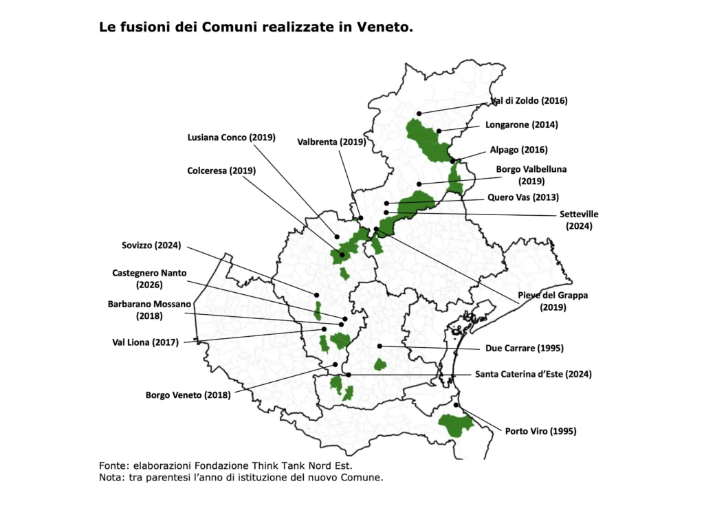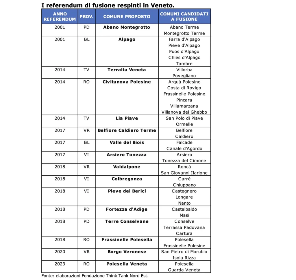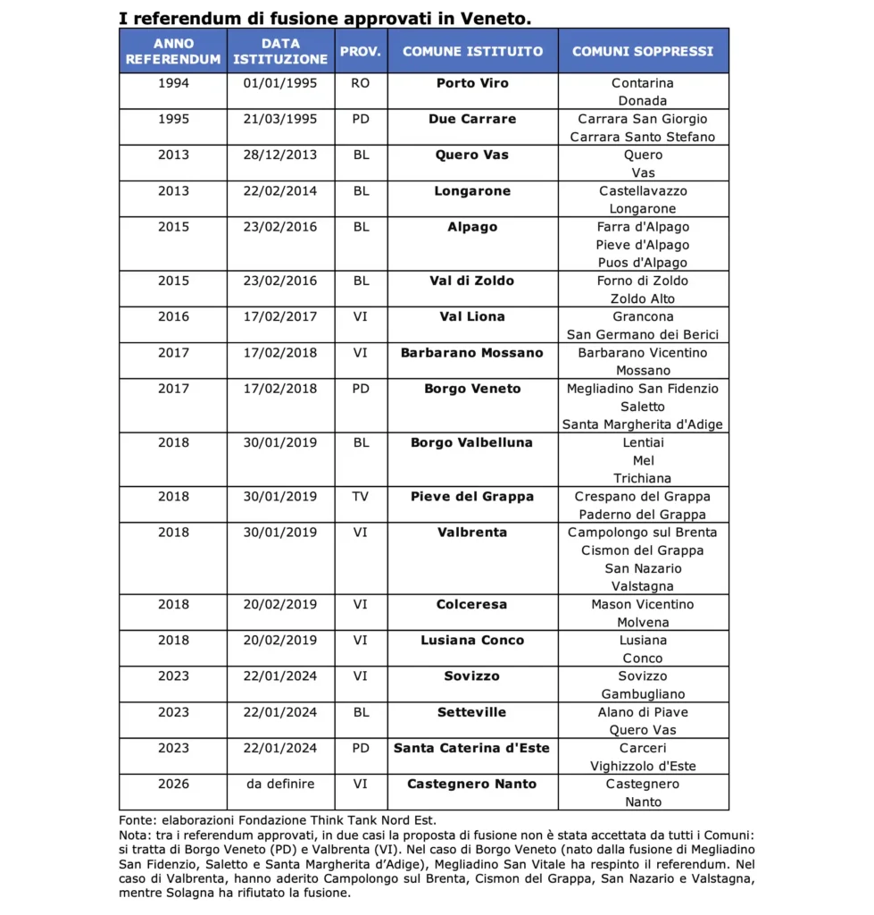 In Veneto, i referendum con esito positivo sono 18 su 34. Secondo la Fondazione Think Tank Nord Est le fusioni sono un’opportunità per i piccoli Comuni e i territori periferici.