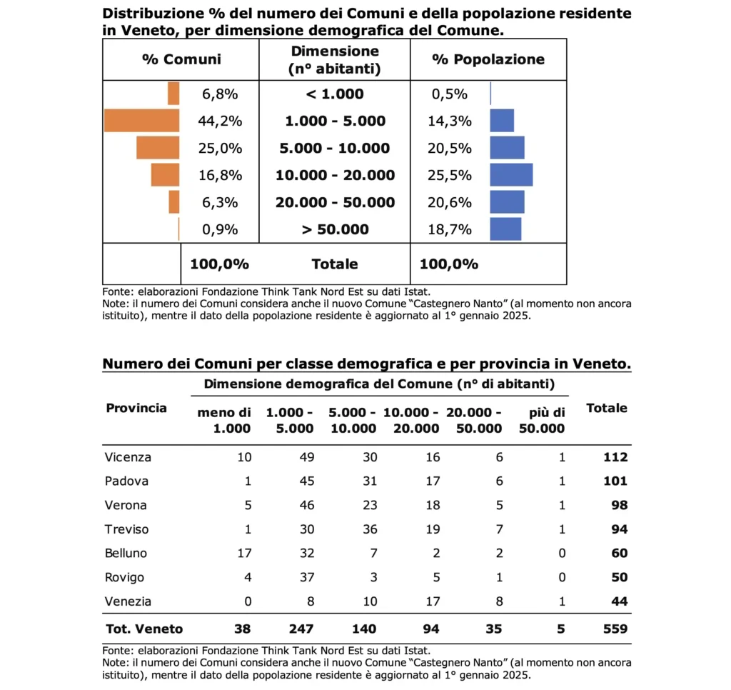In virtù di quest’ultima fusione, il numero totale dei Comuni in Veneto scende a 559: più della metà (285 su 559, il 51%) ha meno di 5.000 abitanti, ma in questi territori vivono solo 714.000 persone circa, meno del 15% della popolazione regionale. Nello specifico, in Veneto ci sono 38 Comuni con meno di 1.000 abitanti (il 6,8% del totale) che ospitano in tutto appena lo 0,5% dei residenti, mentre nei 247 Municipi con un numero di abitanti compreso tra 1.000 e 5.000 (il 44,2%) risiede solamente il 14,3% della popolazione.